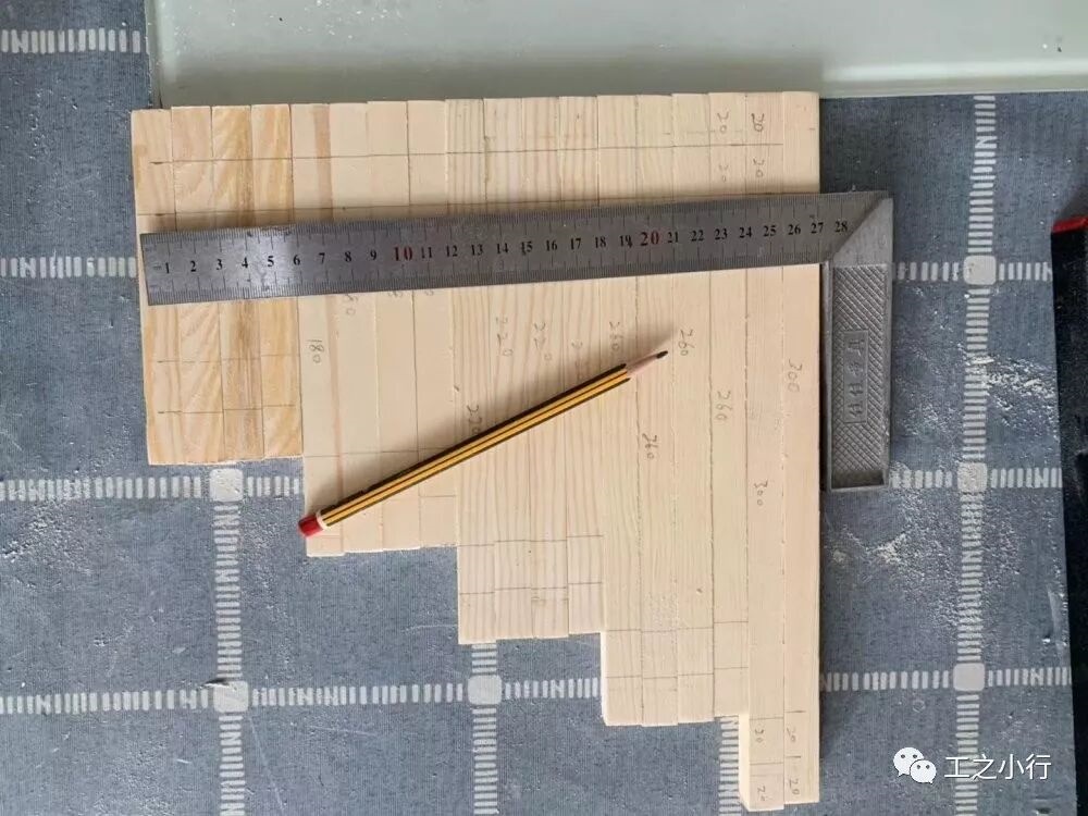 第一步要测量好每根木方的长度,每根木方要如图纸一样对称下来,这样做出来的才美观。300mm*2根、260mm*4根、220mm*4根、180mm*4根、140mm*4根、109mm*4根。